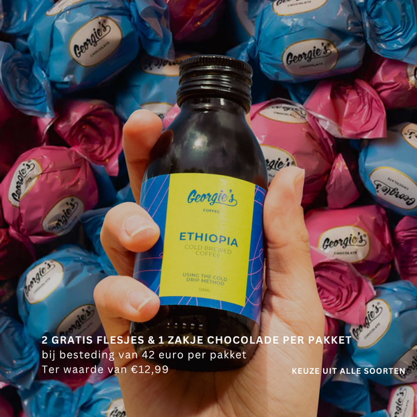 De ultieme combinatie! Bestel een (kerst)pakket vanaf €42,- en ontvang er gratis twee verfrissende koude koffies én een zakje ambachtelijke chocolade bij.